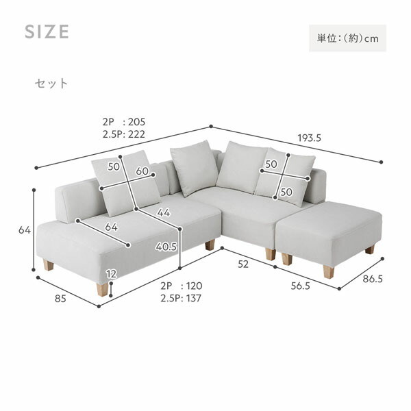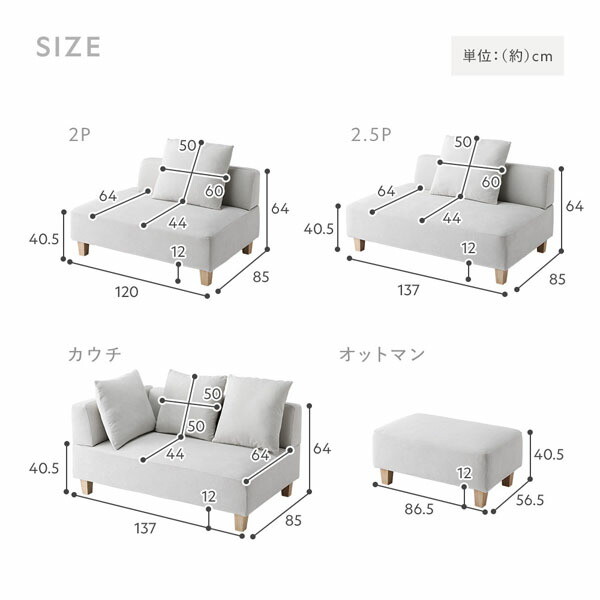 2.5人掛け:幅137×奥行85×高さ52cm(脚を含まず)