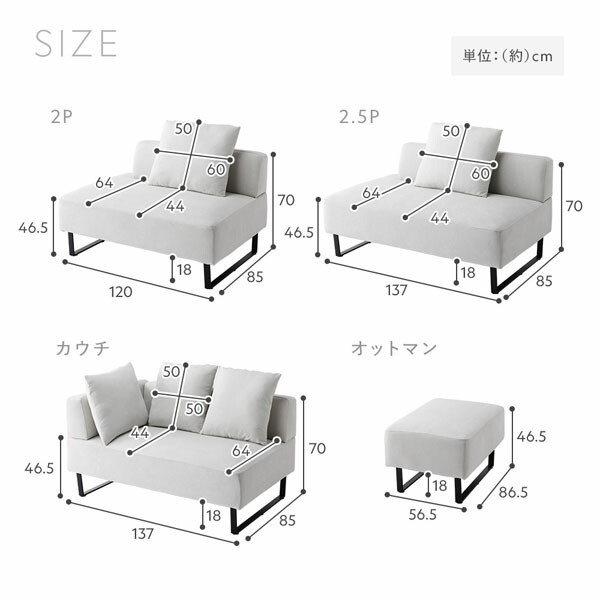 2.5人掛け:幅137×奥行85×高さ52cm(脚を含まず)