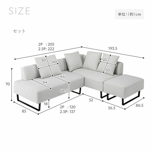 2人掛け+カウチソファ+オットマンセット(スチール脚):(1)122×87×32.5cm・22.82kg、(2)139×87×32.5cm・33.3kg、(3)88.5×58×31cm・8.63kg、(4)79×20×10cm・2.42kg、(5)79×20×10cm・2.42kg、(6)79×20×10cm・2.42kg