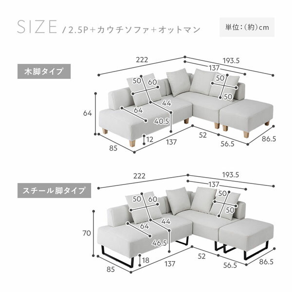 2.5人掛け:幅137×奥行85×高さ52cm(脚を含まず)