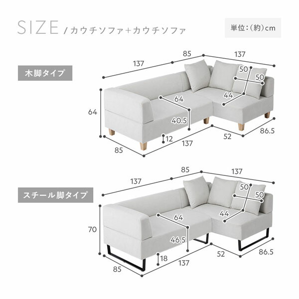 カウチソファ:幅137×奥行85×高さ52cm(脚を含まず)