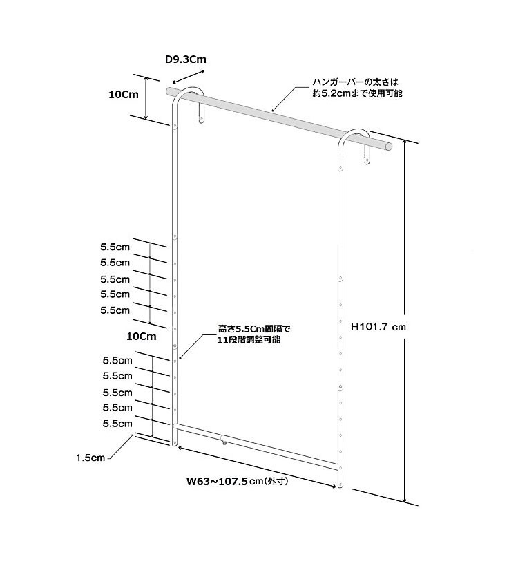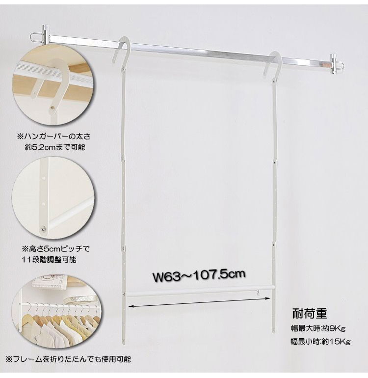 太さ約5.2cmまでのハンガーバーに対応しています。