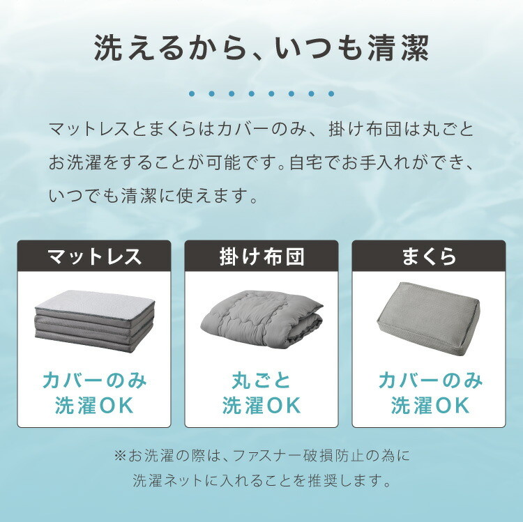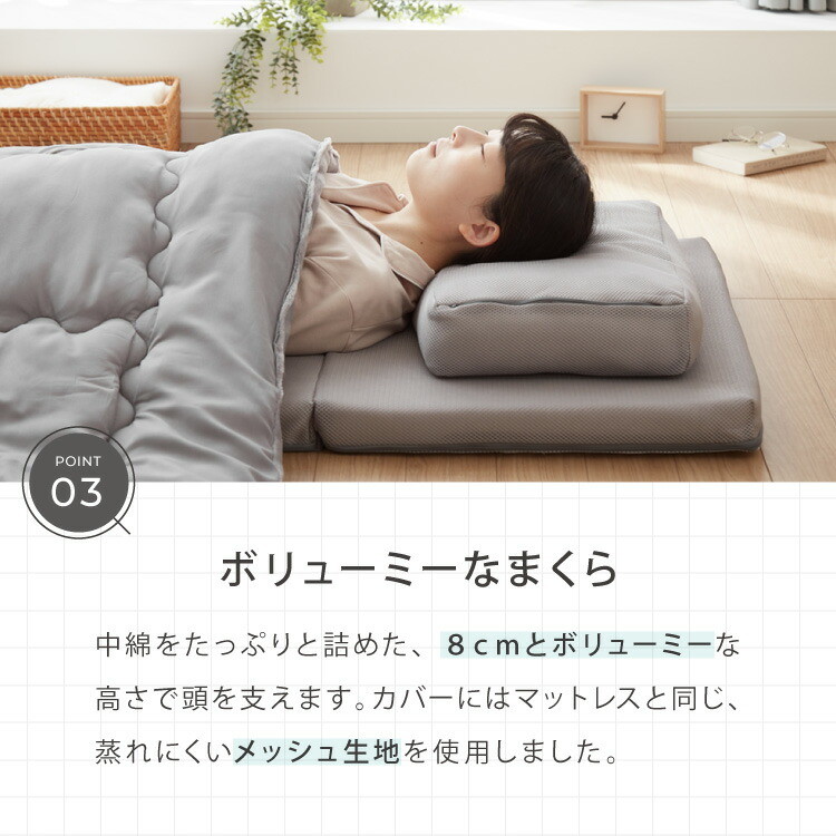 | サイズ/寸法 | <枕> 幅45×奥行35×高さ8cm <掛け布団> 幅150×奥行200cm <マットレス> 幅72×奥行200×厚み5cm 収納時サイズ:幅70×奥行50×45cm |