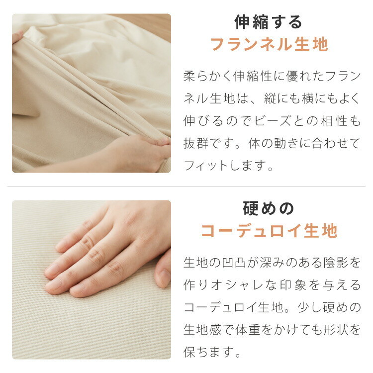 | 原材料/素材/材質 | [側生地] ・伸縮する生地:フランネル生地 ・伸縮しない生地:コーデュロイ生地 [中身]ポリスチレン [ヌード生地]ポリエステル95%、ポリウレタン5% |