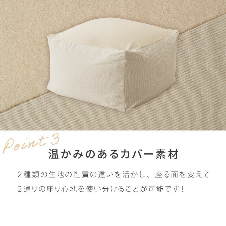 | 原材料/素材/材質 | [側生地] ・伸縮する生地:フランネル生地 ・伸縮しない生地:コーデュロイ生地 [中身]ポリスチレン [ヌード生地]ポリエステル95%、ポリウレタン5% |