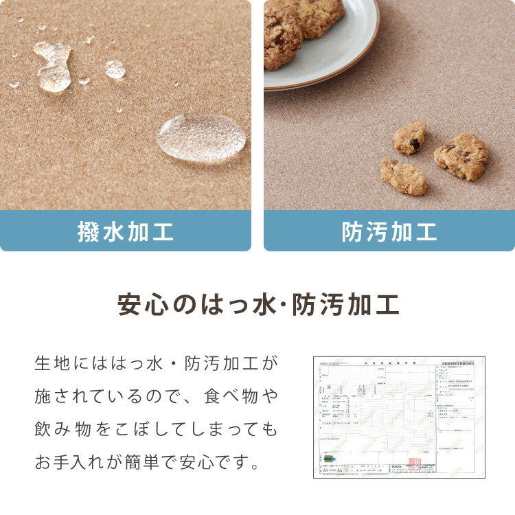 撥水・防汚加工が施されているため飲み物をこぼしてもサッと拭き取れて毎日の使用に安心。