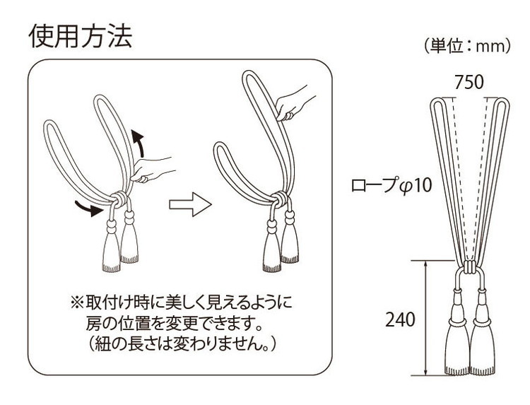 取付け時に美しく見えるように房の位置を変更できます。(紐の長さは変わりません。)