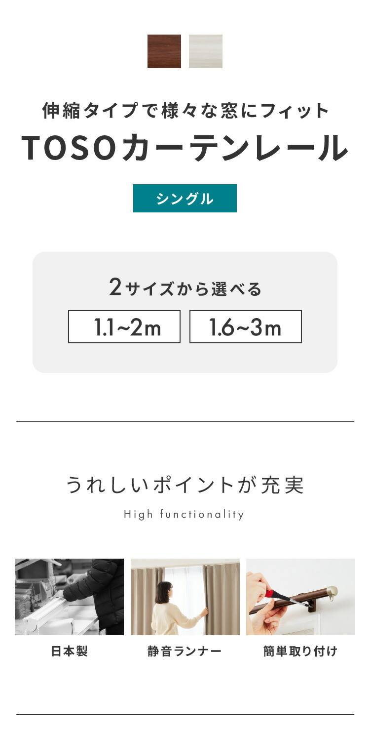 カーテンレール シングル 伸縮 1.1~2.0m 1.6~3.0m TOSO トーソー リネア 静音 カーテンレール 木目ブラウン 1.1~2m