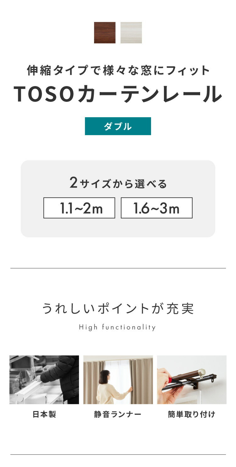 カーテンレール ダブル 伸縮 1.1~2.0m 1.6~3.0m TOSO トーソー リネア 静音 カーテンレール 木目ブラウン 1.1~2m