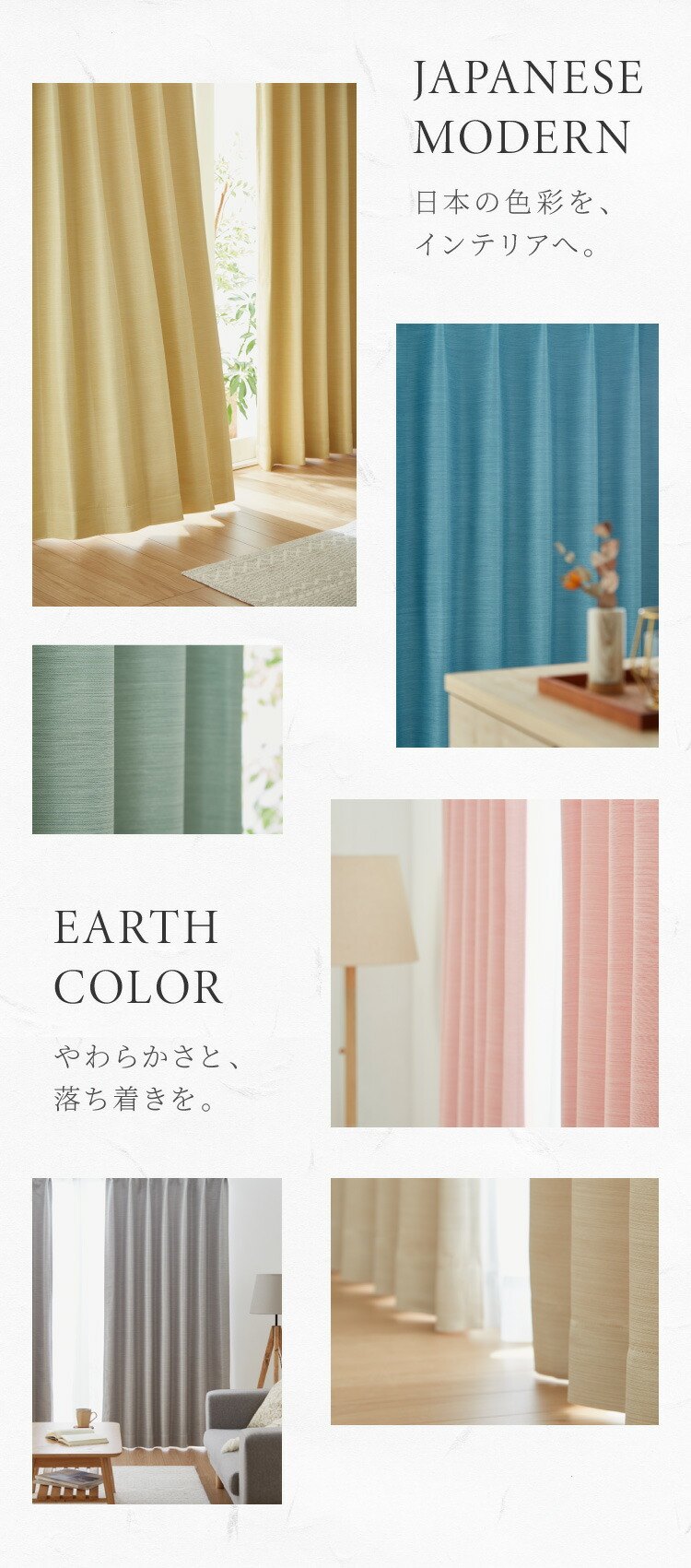 日本の原風景をモチーフにしたカラーを用い、生地の生産から縫製まで全て日本で行うこだわりの国産カーテンです。