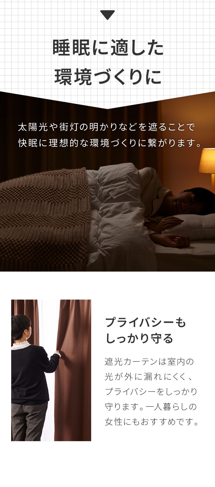 日差しや紫外線を防ぐ1級遮光のカーテンは、睡眠に適した環境をサポートします。
