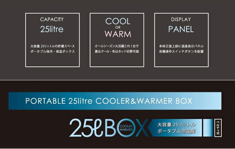 ●『保冷』と『保温』の2つの機能を搭載した冷温庫。夏は『保冷』、冬は『保温』と使い分けることができます。25Lの大容量サイズ。家庭用のACだけでなくDC12Vにも対応するので車載用としてもご利用いただけます。アウトドアでも大活躍。