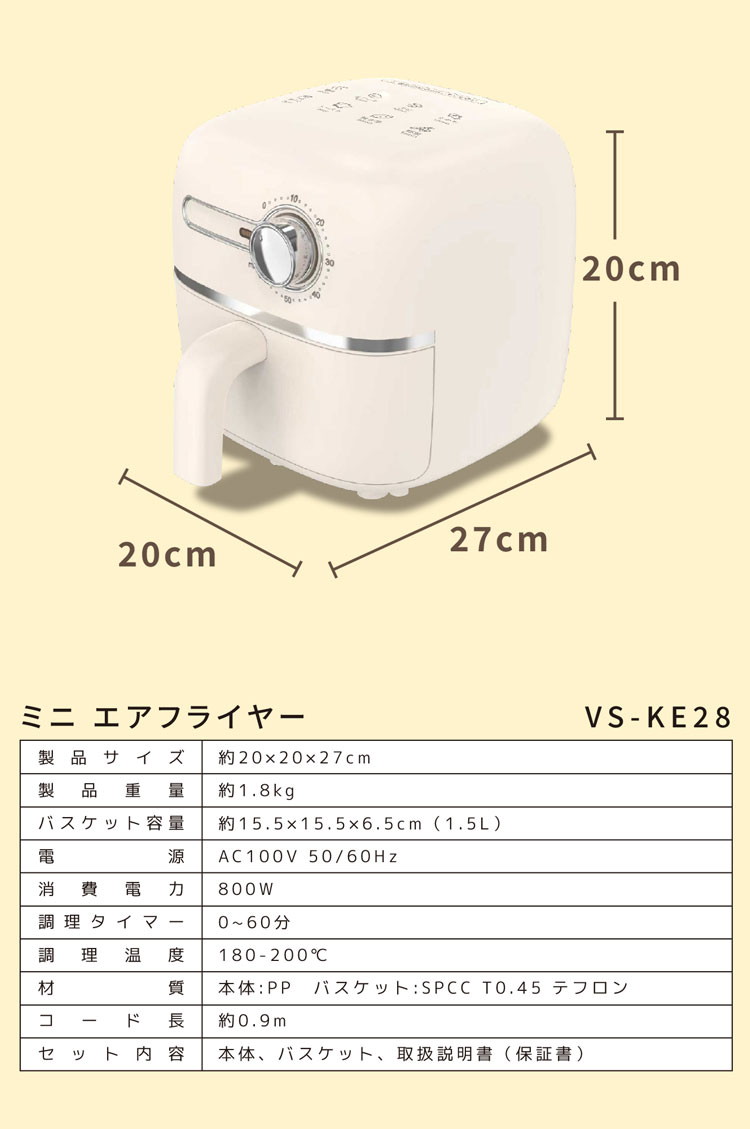 ミニエアフライヤー エアフライヤー ノンフライ お手入れ簡単 1.5L 油不要 VS-KE28 ベルソス