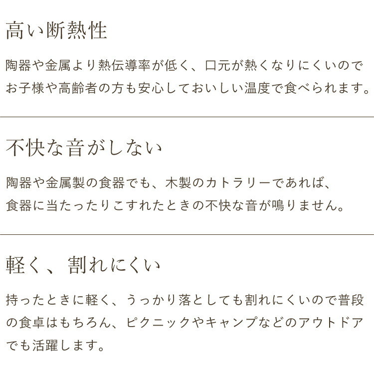 木製のナチュラルな質感・さわり心地をはそのままに、利便性を高めたカトラリーです。