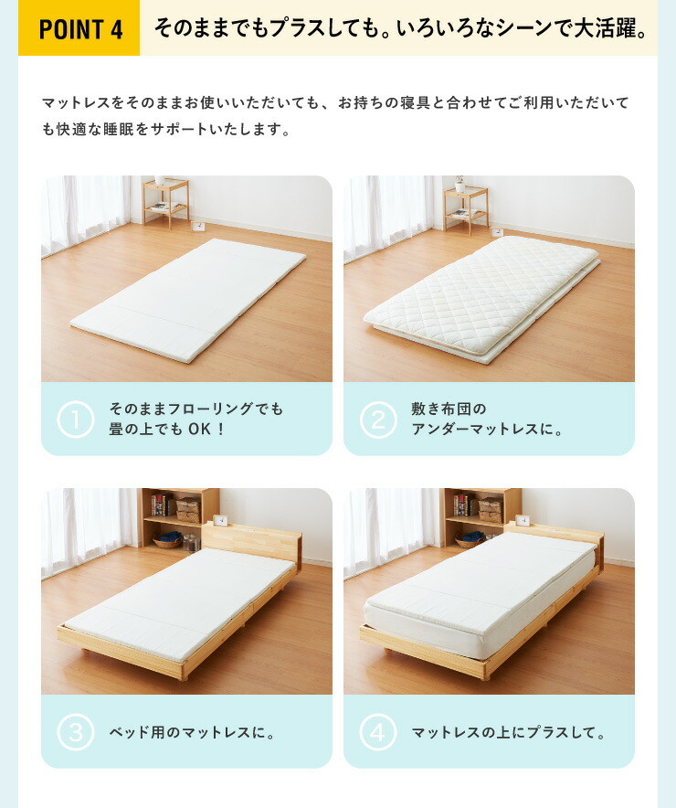 今お使いのマットレスに一枚重ねることで、快適な寝心地を実現します。