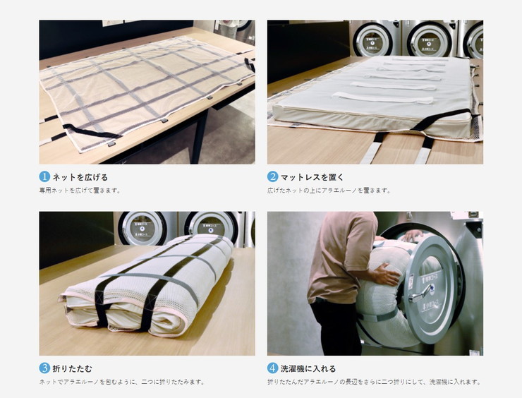アラエルーノはフトン巻きのジローが生み出したフトン巻きの技術を利用して開発され、折りたたんで洗濯機に入れることでマットレスを丸洗いできます!
