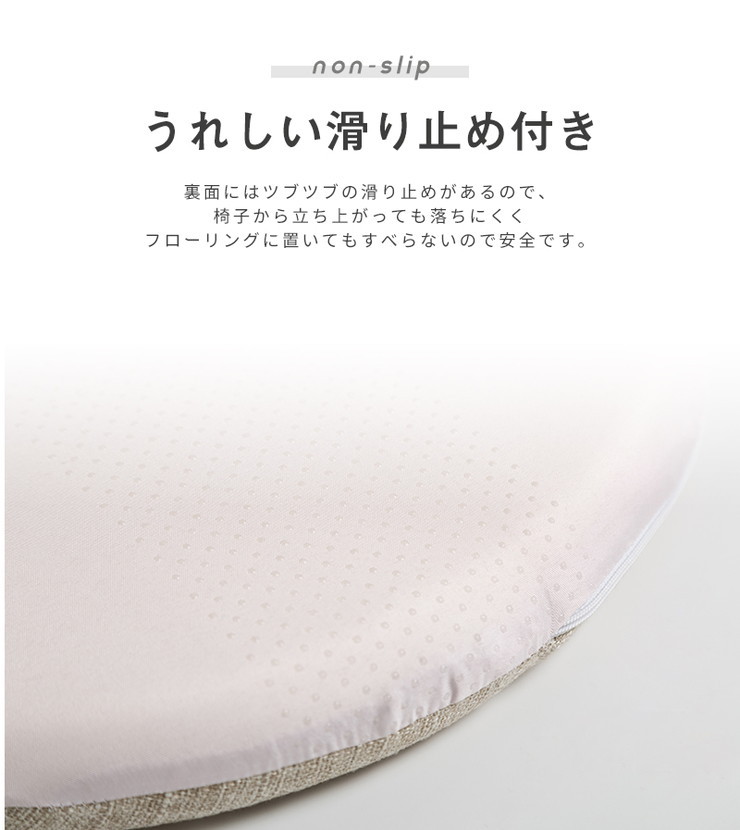 裏面には滑り止めが施されており、フローリングや椅子の上やズレにくい仕様です。