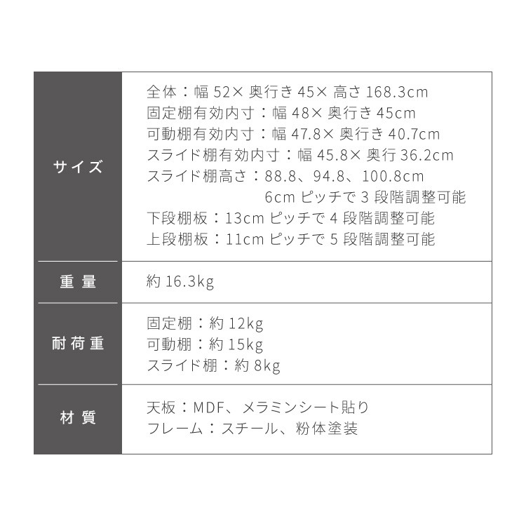 スライド棚高さ:88.8、94.8、100.8cm(6cmピッチで3段階調整可能)