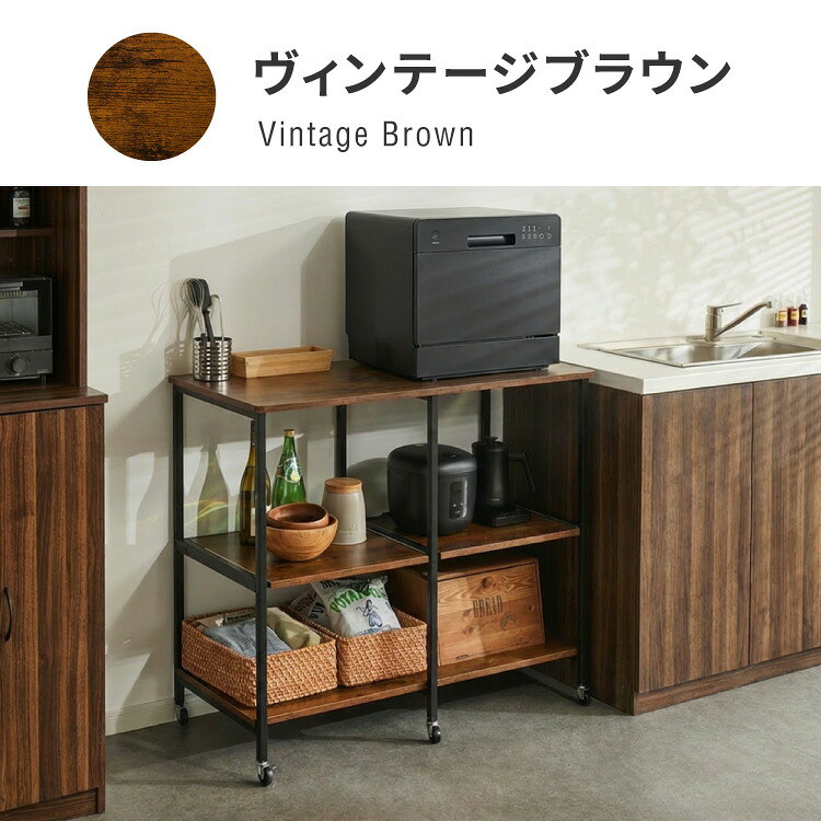 ダブルスライド棚 キャスター付き キッチンカウンター 幅100 VOID STACK series 大型レンジ対応 ヴィンテージブラウン