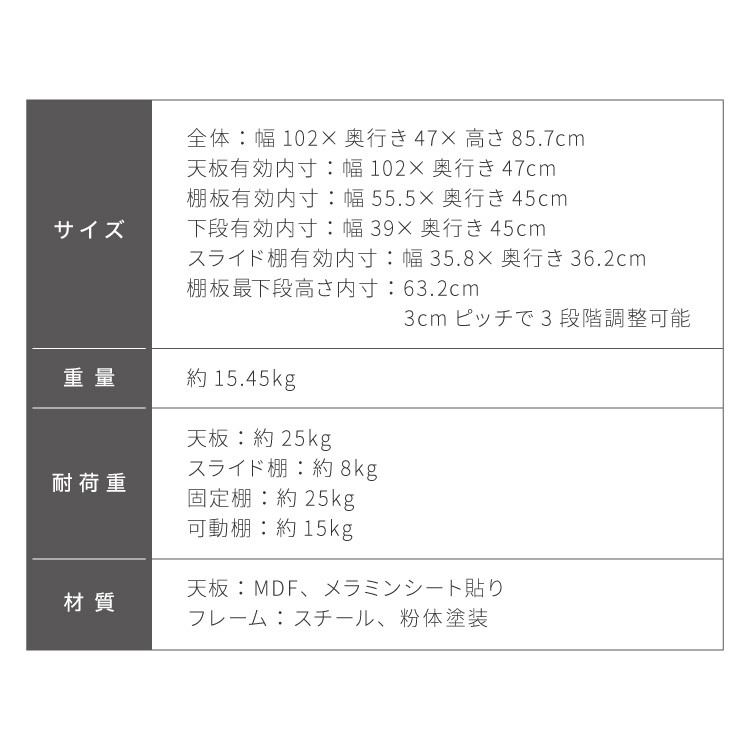棚板最下段高さ内寸:63.2cm(3cmピッチで3段階調整可能)