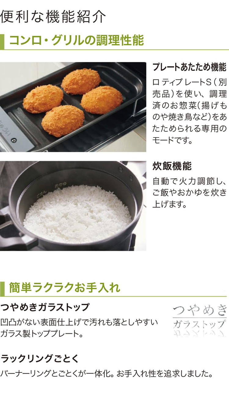 ・コンロバーナー:コンロ消し忘れ消火機能・調理油過熱防止装置・焦げつき自動消火機能・中火点火機能