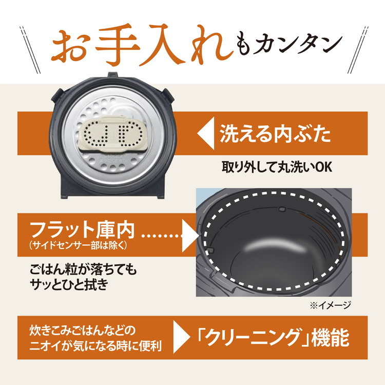 「洗える内ぶた」 ステンレス内ぶたがはずして洗えるのでいつも清潔。「フラット庫内(サイドセンサー部は除く)」 庫内がフラットになっているので、落ちたごはん粒や汚れをサッとひと拭き。