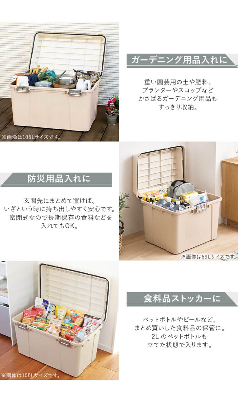 | 原材料/素材/材質 | ●主要材質:本体・フタ:ポリプロピレン、バックル:ステンレススチール、パッキン:EVA |