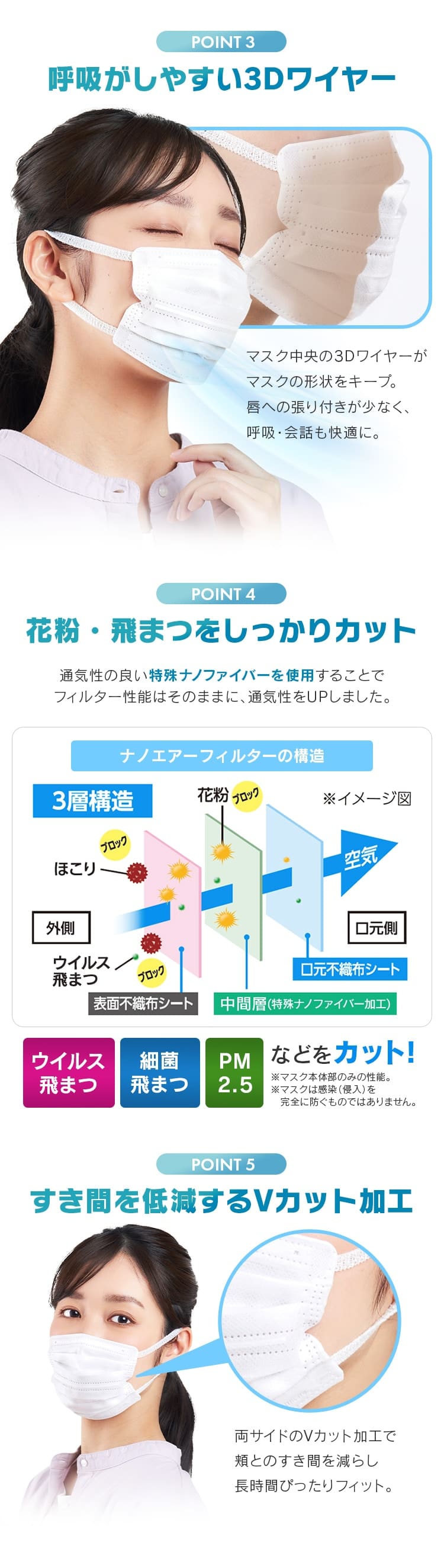 | 原材料/素材/材質 | ●素材: [本体・フィルター]ポリプロピレン、ポリフッ化ビニリデン [耳ひも]ポリエステル、ポリウレタン、レーヨン [ノーズフィッター、3Dワイヤー]ポリエチレン |