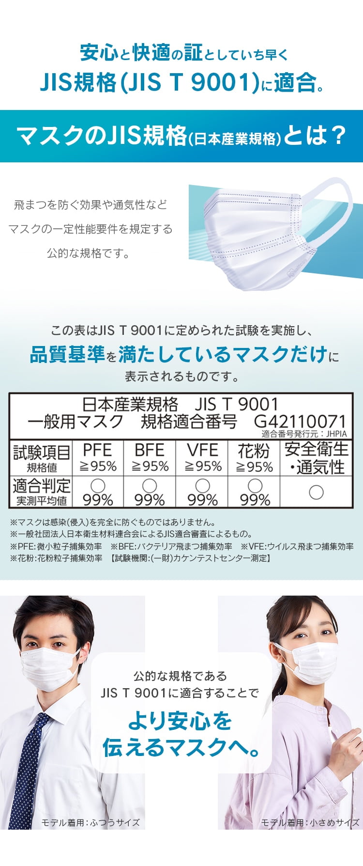 「JIS T 9001 (一般用マスク)」に適合した不織布マスクです。