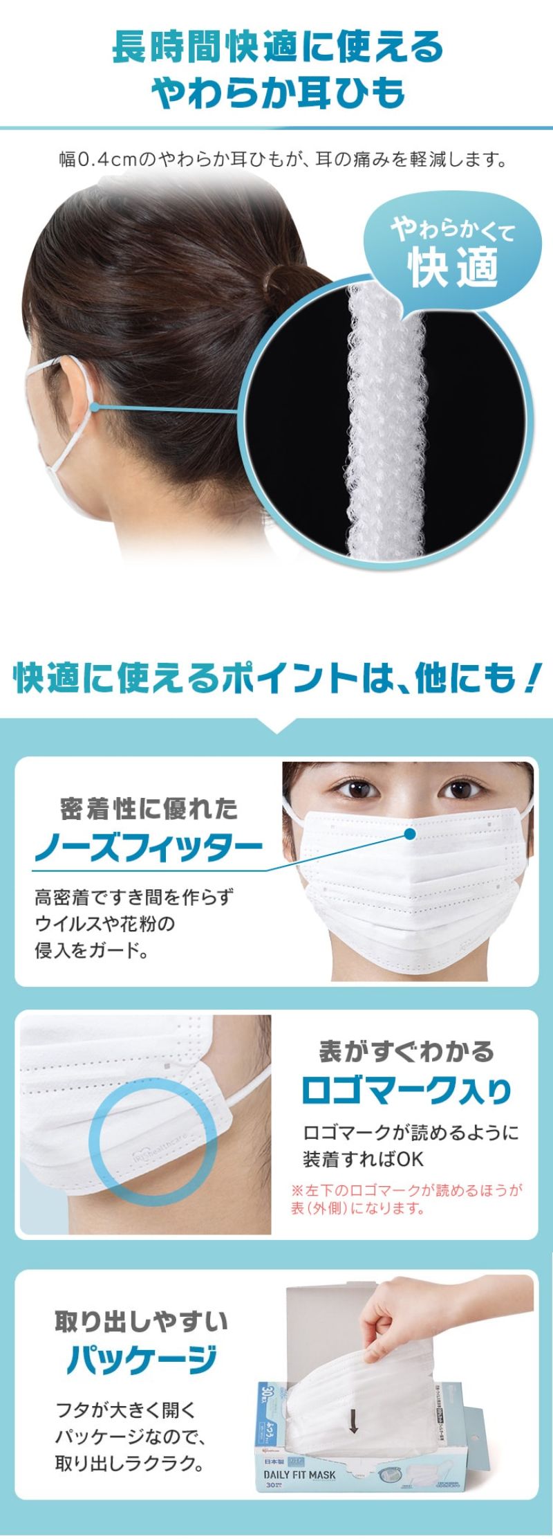 やわらか丸耳ひもで耳が痛くなりにくく、一日中快適に過ごせます。