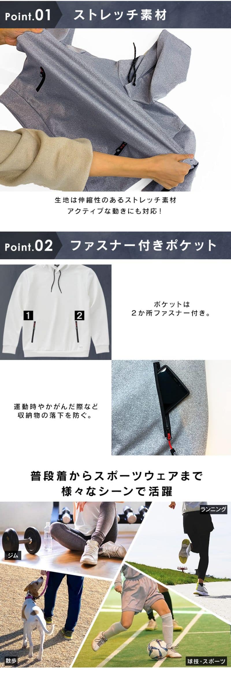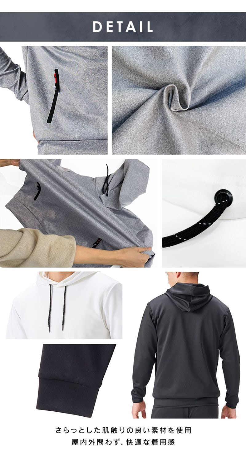 軽くて良く伸びるから動きやすい、ストレッチフーディープルオーバー。