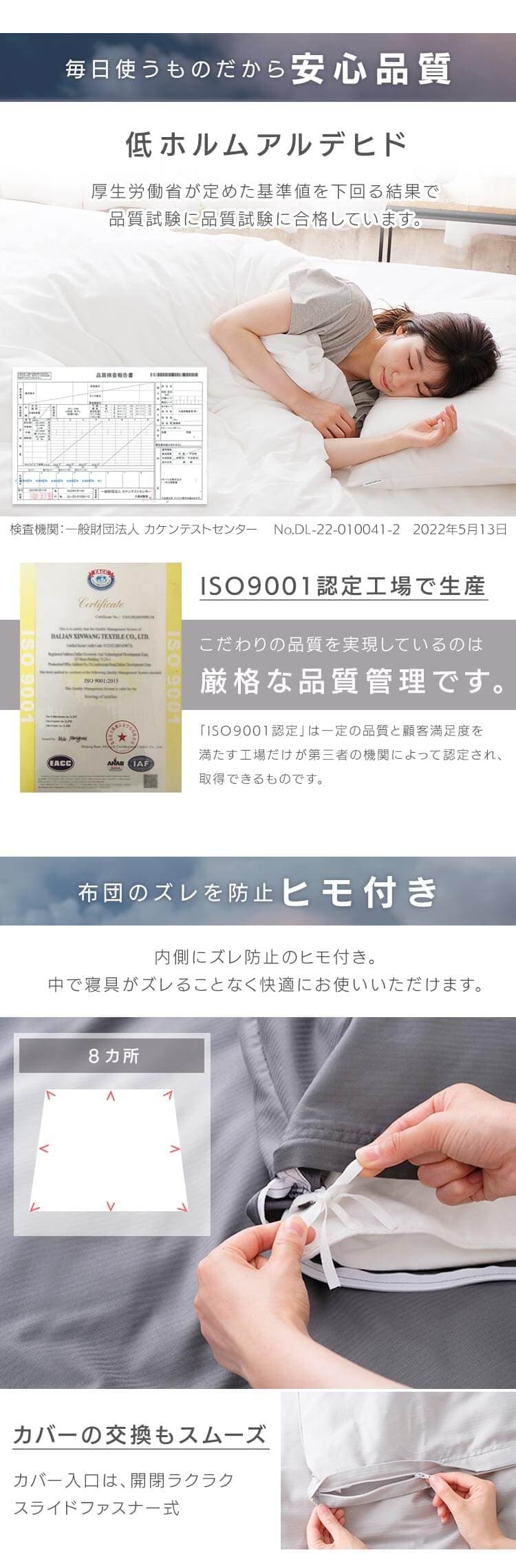 | その他詳細 1 | ●ファスナー付き、紐6箇所 (ダブルサイズは8箇所) ●お手入れ方法: 家庭用洗濯機で丸洗い可能です。 |
