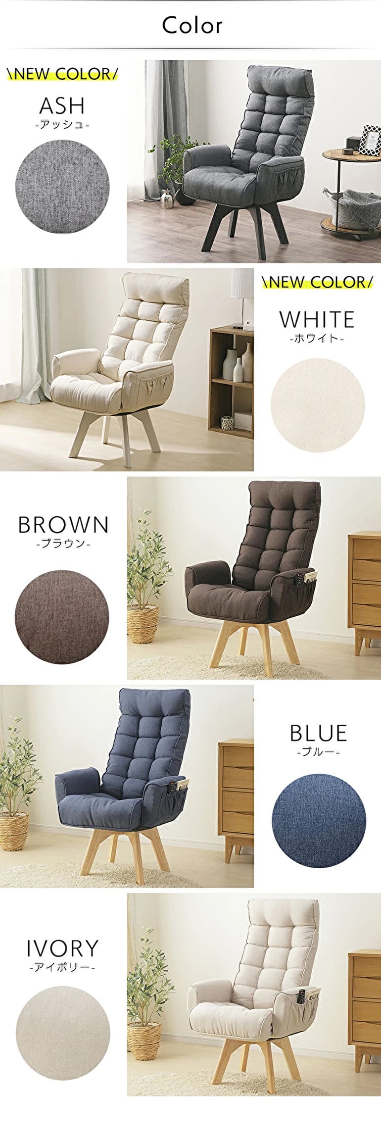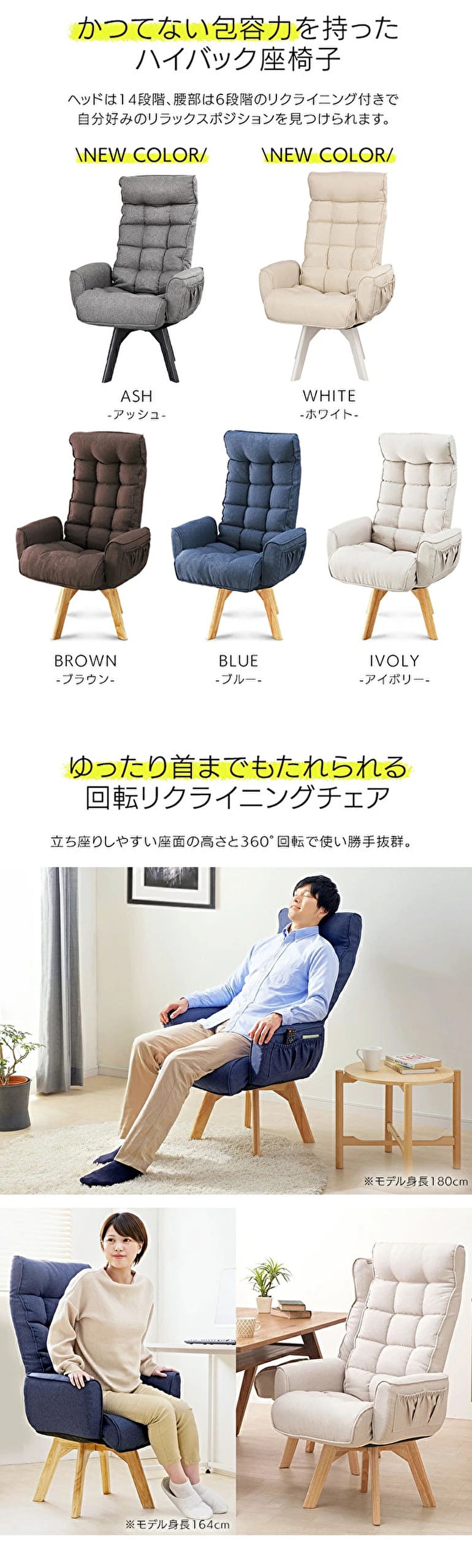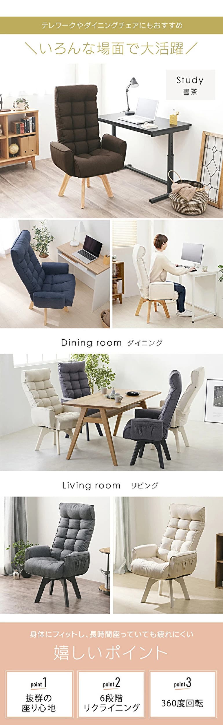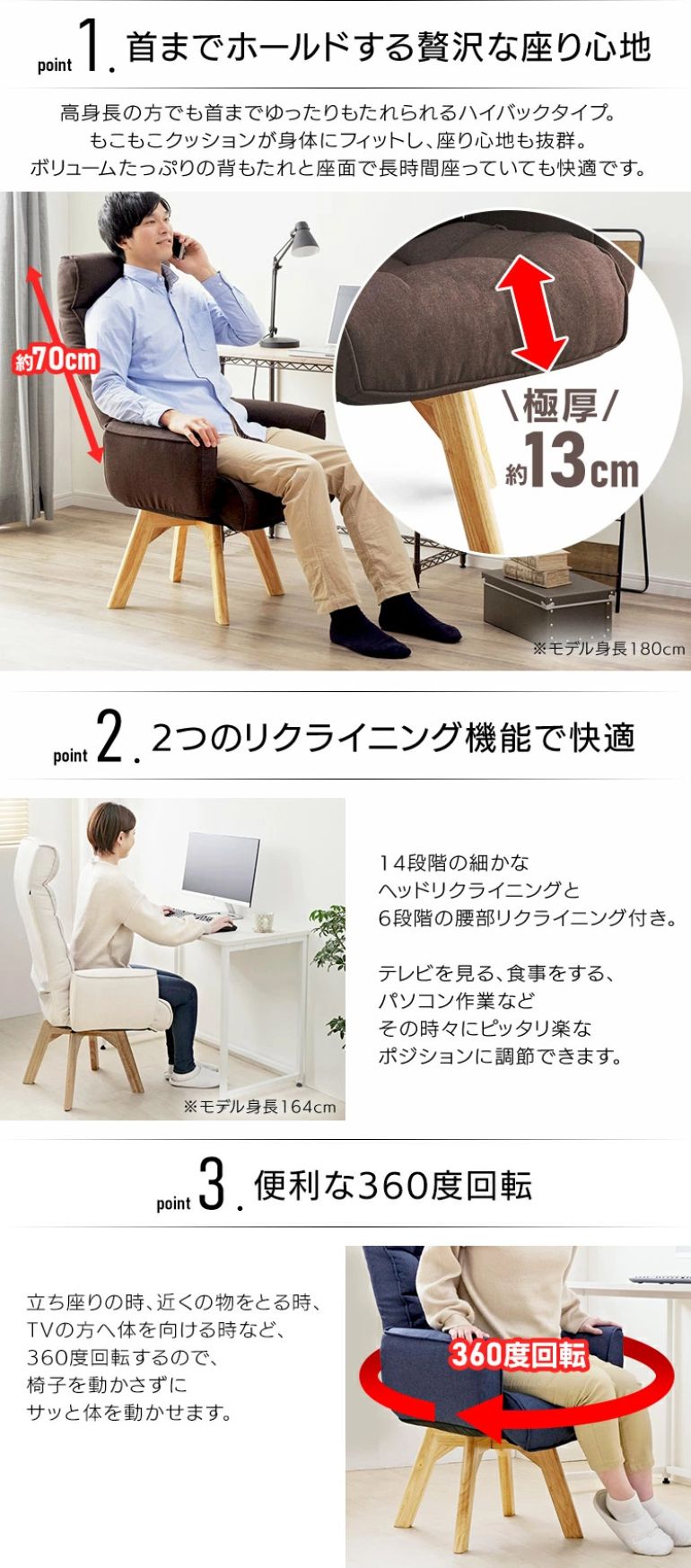 快適性とインテリア性を併せ持った回転ファブリックチェア。背の高い男性でも首までゆったりもたれられるハイタイプです。座面が360度回転するので、物を取る時も便利。座面が高いので座りやすく、立ち上がりも楽にできます。