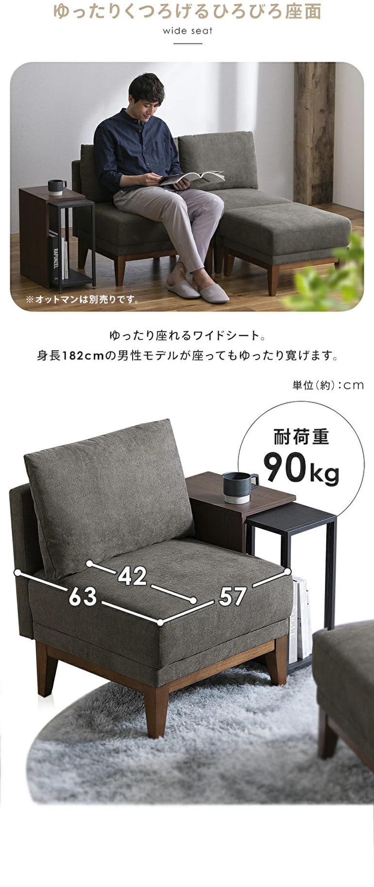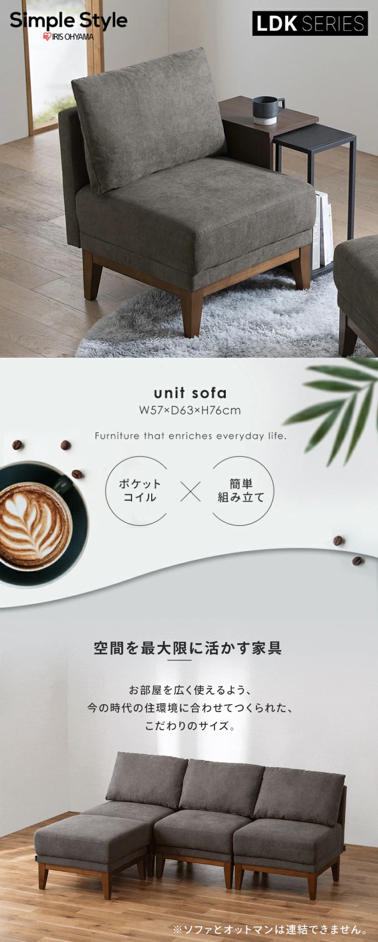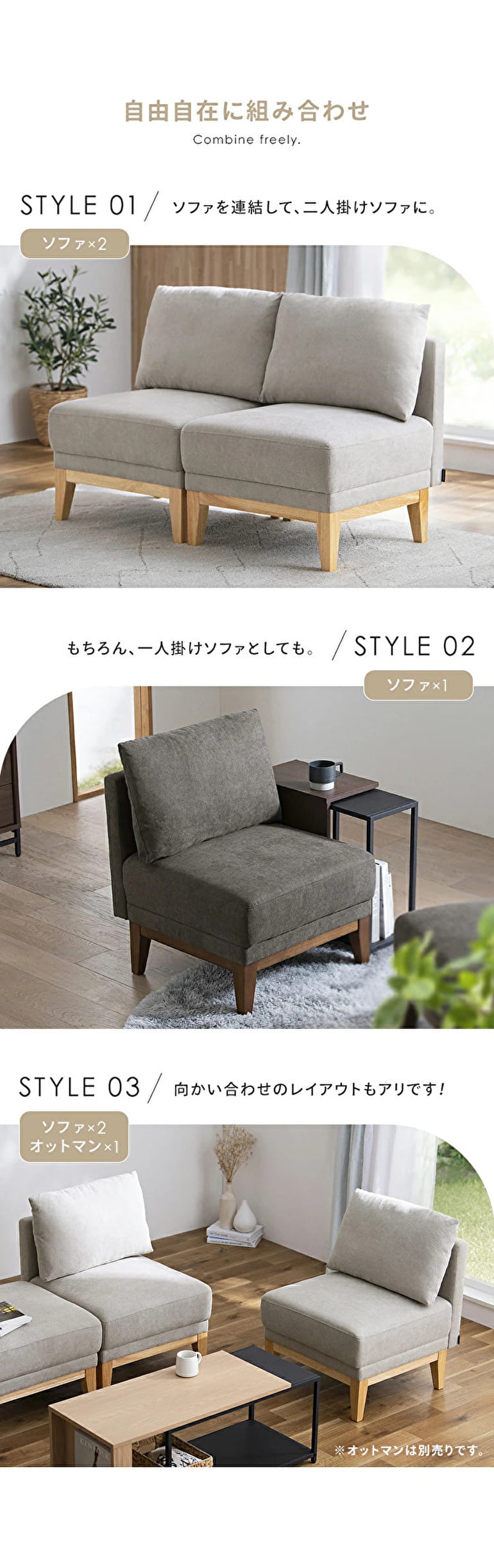 生活やお部屋の間取り、お好みのスタイルに合わせて組み合わせできるユニットソファ。1人掛けソファはもちろん、組み合わせて2人掛けソファ、オットマンとの併用も可能です。