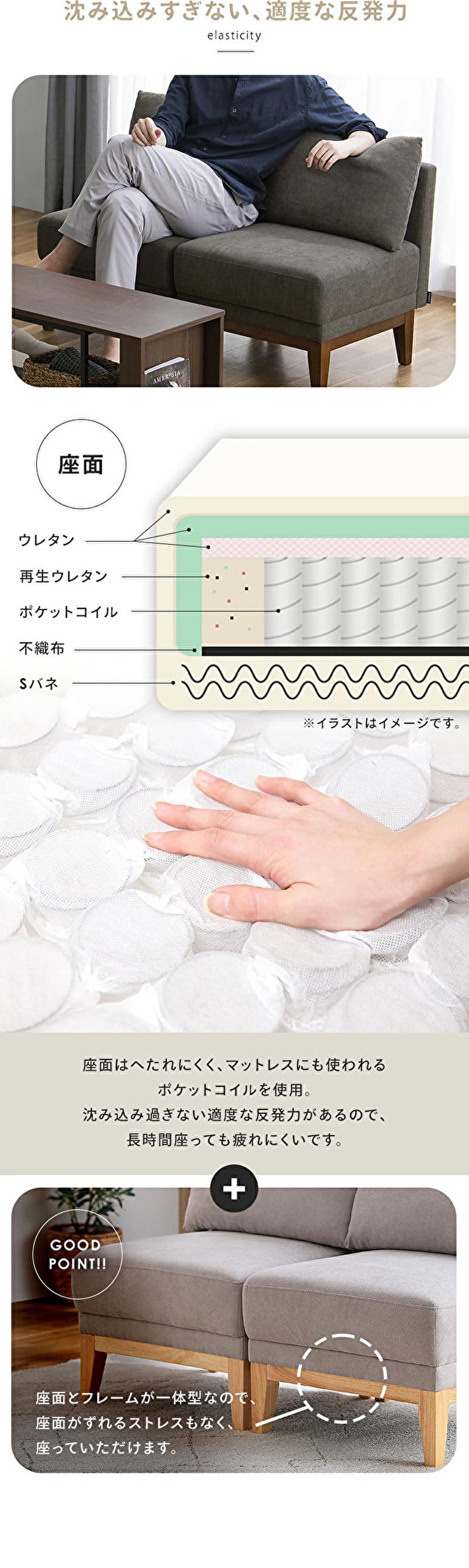 | 原材料/素材/材質 | 主要材質: [構造部材]天然木(ラバーウッド、ユーカリ)、合板 [表面加工]ウレタン樹脂塗装 [張り材]ポリエステル [クッション材]ウレタンフォーム、鋼製ばね、ゴムバンド(ウェービングテープ) |