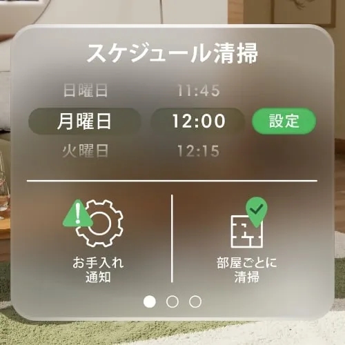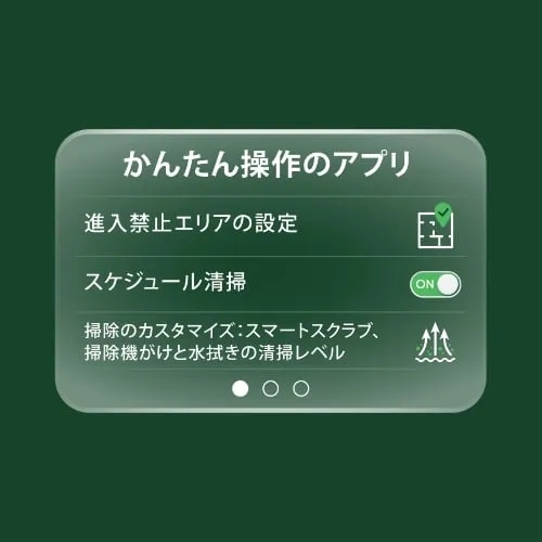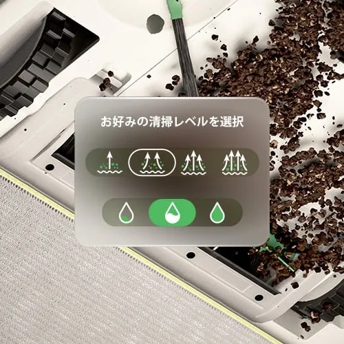走行回数や吸引力を選択し、マイクロファイバーモップパッドに供給する水分量も調整します。