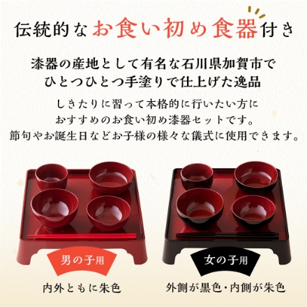お祝い膳.comでは、男の子用(朱色)と女の子用(黒色)のお重をそれぞれご用意しました。