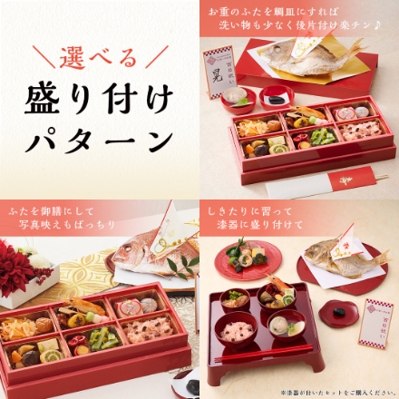| 内容量 | ●お食い初め重6マス([1] 日向夏紅白なます、[2]梅干し、[3]ピーカンナッツ飴炊き、[4]寿マロン、[5]ボイル海老、[6]三色だんご、[7]福寿栗きんとん、[8]てまり餅、[9]椎茸煮・うま煮、[10]揚げかま(枝豆チーズ)、[11]なごみ巻き(ほうれん草)、[12] たこ玉子、[13] 菊花くらくら和え) ●祝い鯛姿焼き(水揚げ時加工前1.5kg / 下処理焼き加工後800g)×1 ●赤飯100g×2 ●蛤×2 ●お吸い物×2 ●歯固め石×1 ●祝箸×2 ●鯛飾り×1 ●敷き紙(白)×1 ●金紙×1 ●立札×1 ●お名前シール×1 ●お食い初め漆器セット(膳×1、椀×4(膳:W27.7×D27.7×H5.7cm、平椀:直径10×H4cm、飯椀:直径10×H5.8cm、汁椀:直径:9.2×H5cm、つぼ椀:直径:7.4×H5cm(ウレタン塗装))、箸×1(箸:22.5cm)) |
