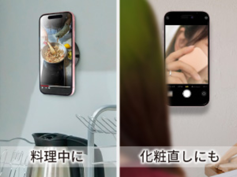 マグネット&真空吸着で場所を選ばずスマホを設置可能!