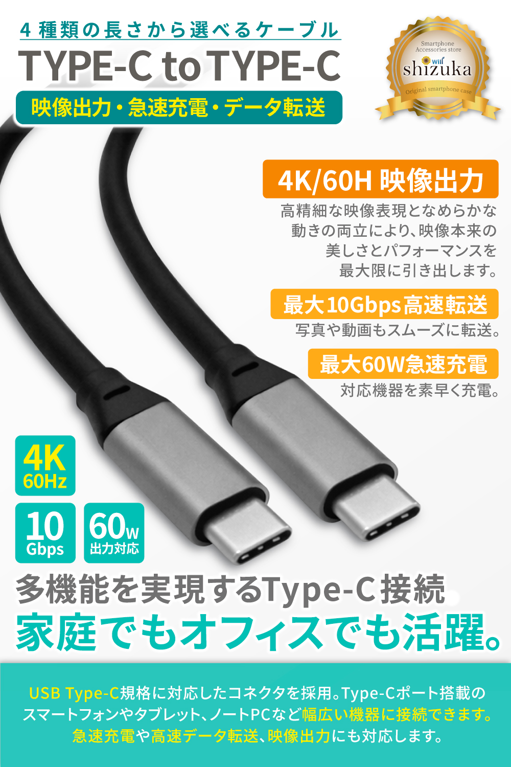 シズカウィル Type C ケーブル データ転送 4K 60Hz 充電ケーブル PVC素材 断線防止 柔らかい テレワーク リモート 在宅勤務 Type-c機種対応 急速充電 映像出力 10G 60W ブラック 1.0m 1個入り