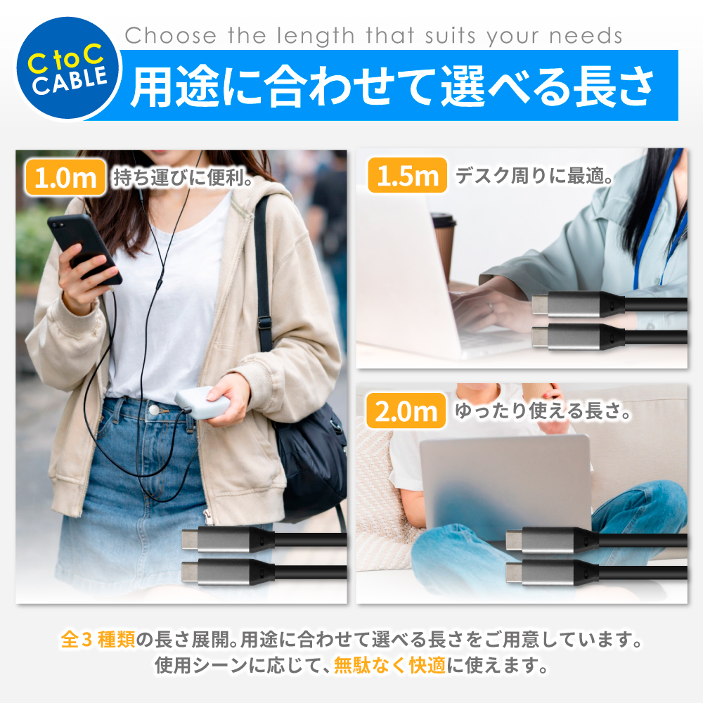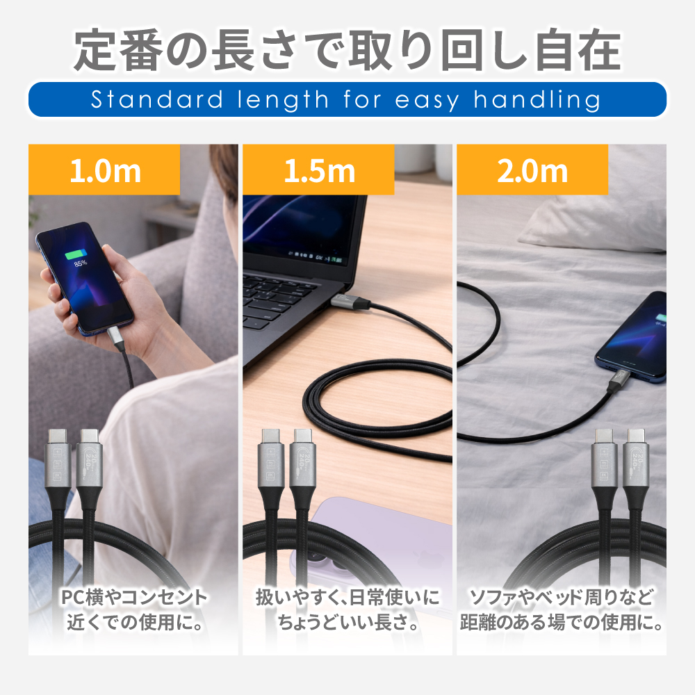 = 1.0m / 1.5m / 2.0mから用途に合わせて選択可能