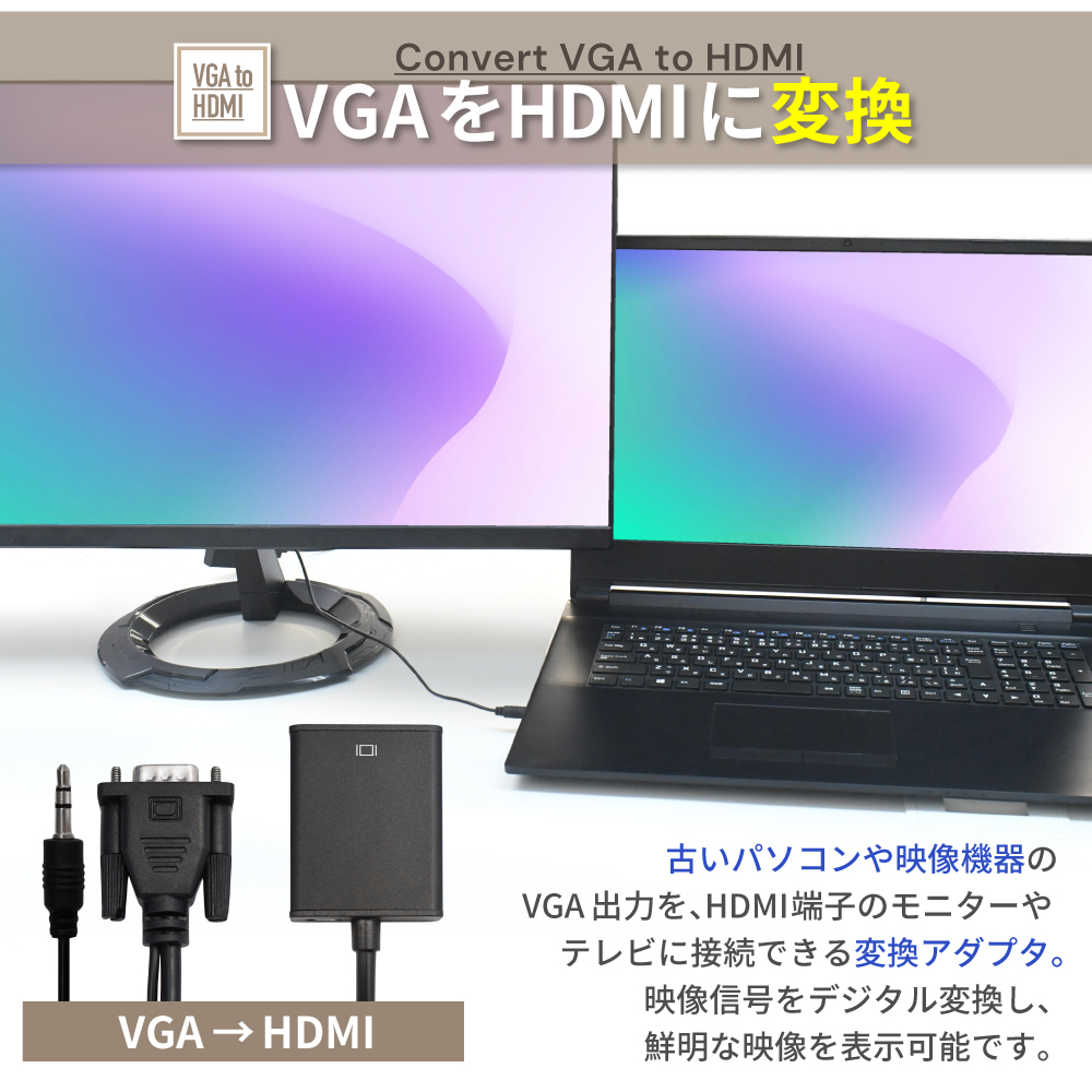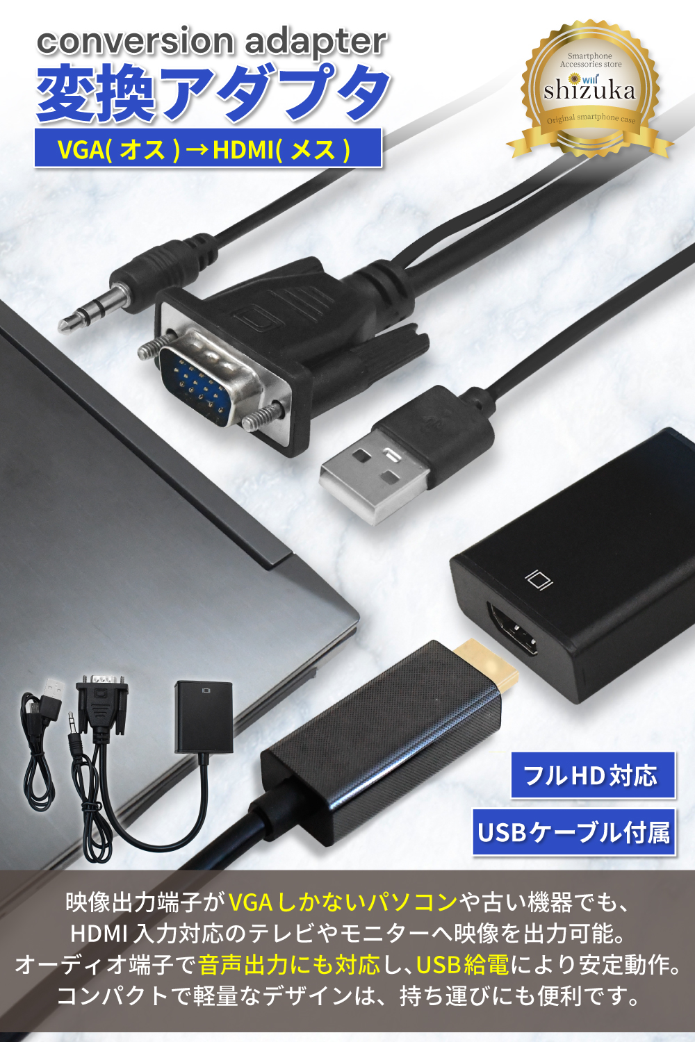 シズカウィル VGA to HDMI 変換アダプタ VGA変換 アダプター 高速転送 HDMI フルHD hdmiケーブル 変換ケーブル Windows 用 MacBook 用 パソコン ノートPC 軽量 テレビ 接続 モニター ブラック 1個入り
