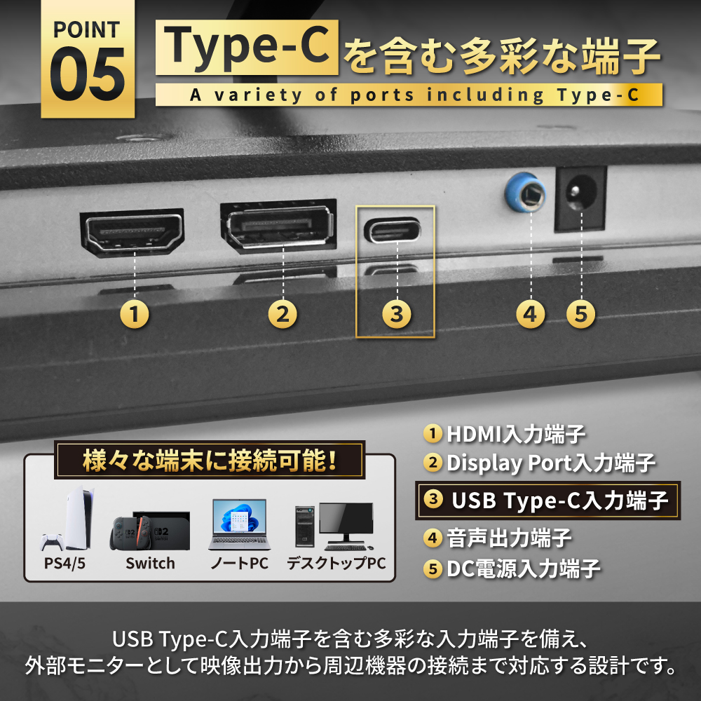 ・USB Type-C端子は映像入力対応のみで、給電機能は搭載しておりません。