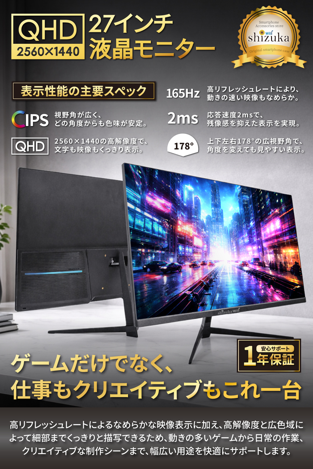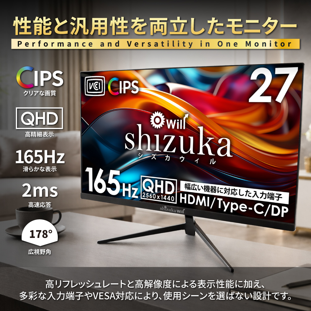 165Hz 高リフレッシュレート / QHD ( 2560×1440 ) / USB Type-C入力 / 広視野角パネル / スピーカー搭載