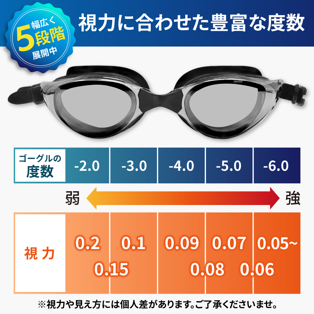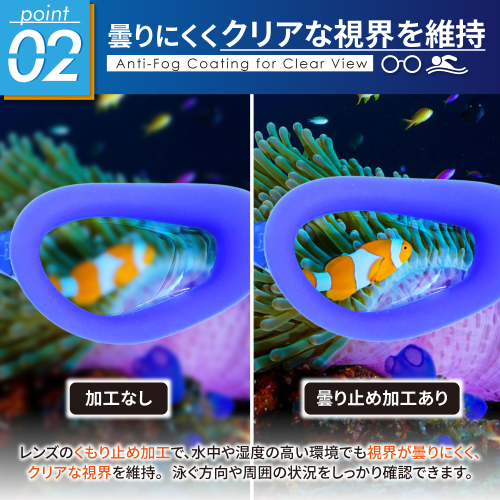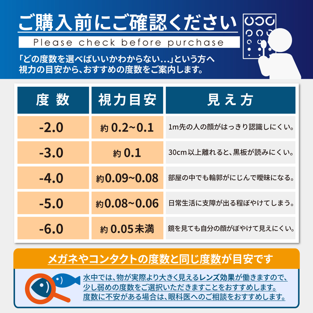-2.0から-6.0の選べる度付きレンズで、水中のぼやけをクリアに補正!