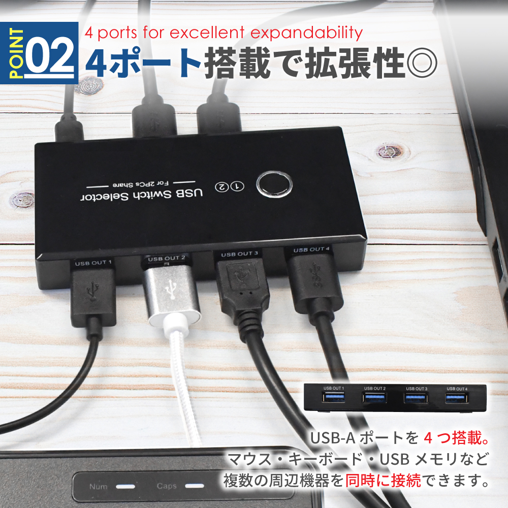 ワンタッチ操作と4ポート搭載で、作業環境を快適にサポートします。