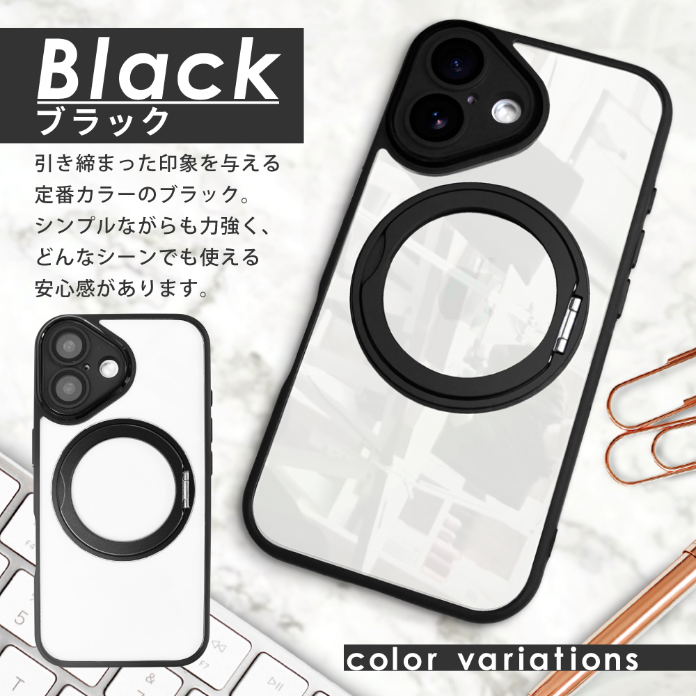 =余裕を持って指を通せる、360°回転するスマホリング付き