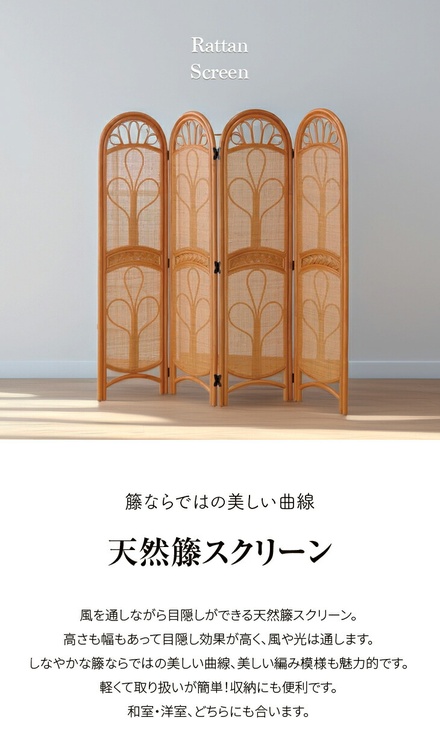風を通しながら目隠しができる天然籐スクリーン。高さも幅もあって目隠し効果が高く、風や光は通します。しなやかな籐ならではの美しい曲線、美しい編み模様も魅力的です。軽くて取り扱いが簡単!収納にも便利です。和室・洋室、どちらにも合います。