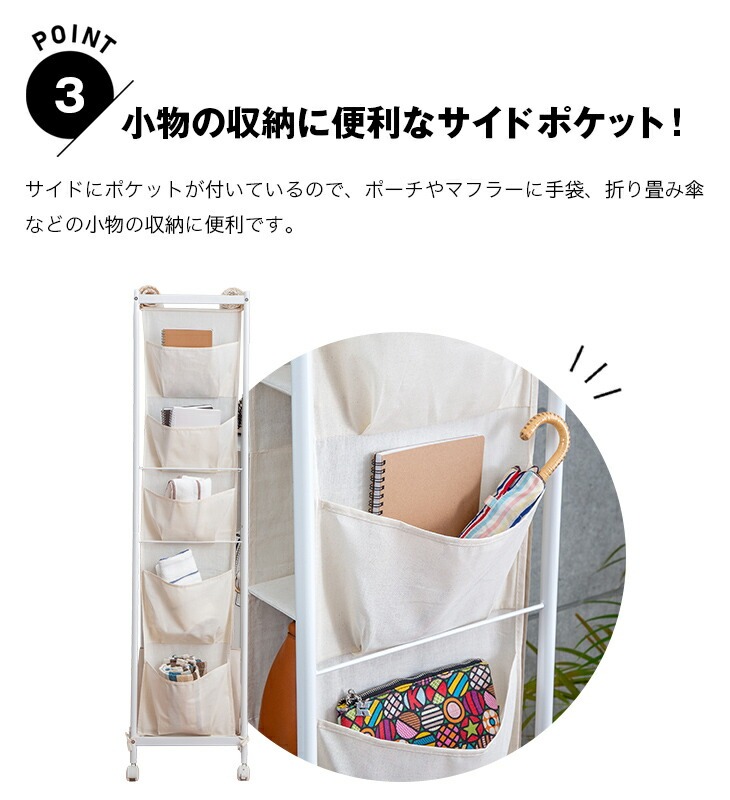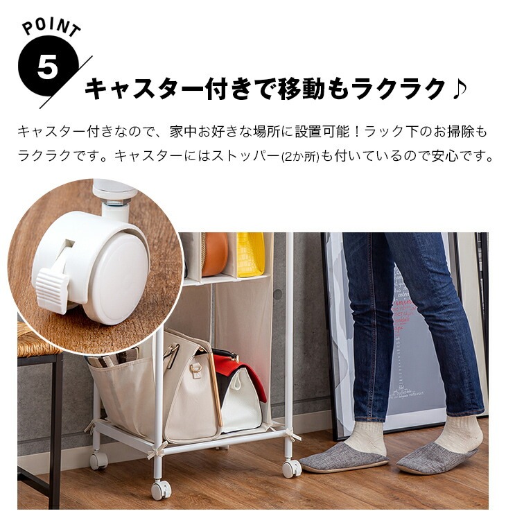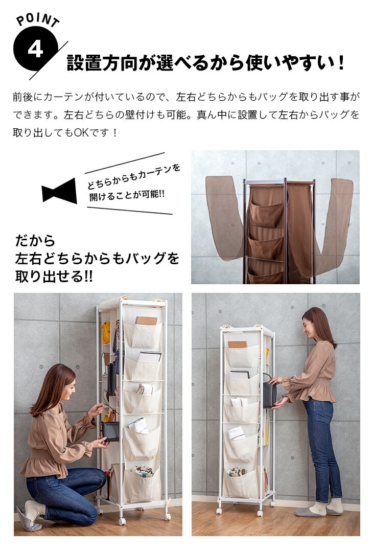 バッグ収納ラック 3列 キャスター付き カーテン付き サイドポケット付き ホワイト
