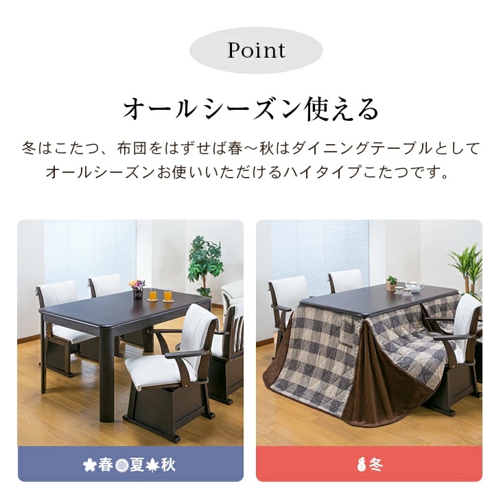 冬はこたつ、布団を外せば春夏秋はダイニングテーブルとして、オールシーズン使えるハイタイプラウンドこたつ。テレワークなどの在宅勤務にも便利なダイニングテーブルです。天板から脚の形状まで角をとった優しい丸みのあるデザイン。万が一ぶつかった際も傷つけにくくなっています。小さなお子様がいるご家庭でも安心です。立ち座り時の足腰に不安を抱えられているご両親へのプレゼントにもおすすめです。ヒーターは定評ある「華芝ジャパンKJU-600FC」を採用。パワフル600Wファン付き薄型ヒーターで効率よく暖気が回ります。温度調節に便利な手元コントローラータイプ。